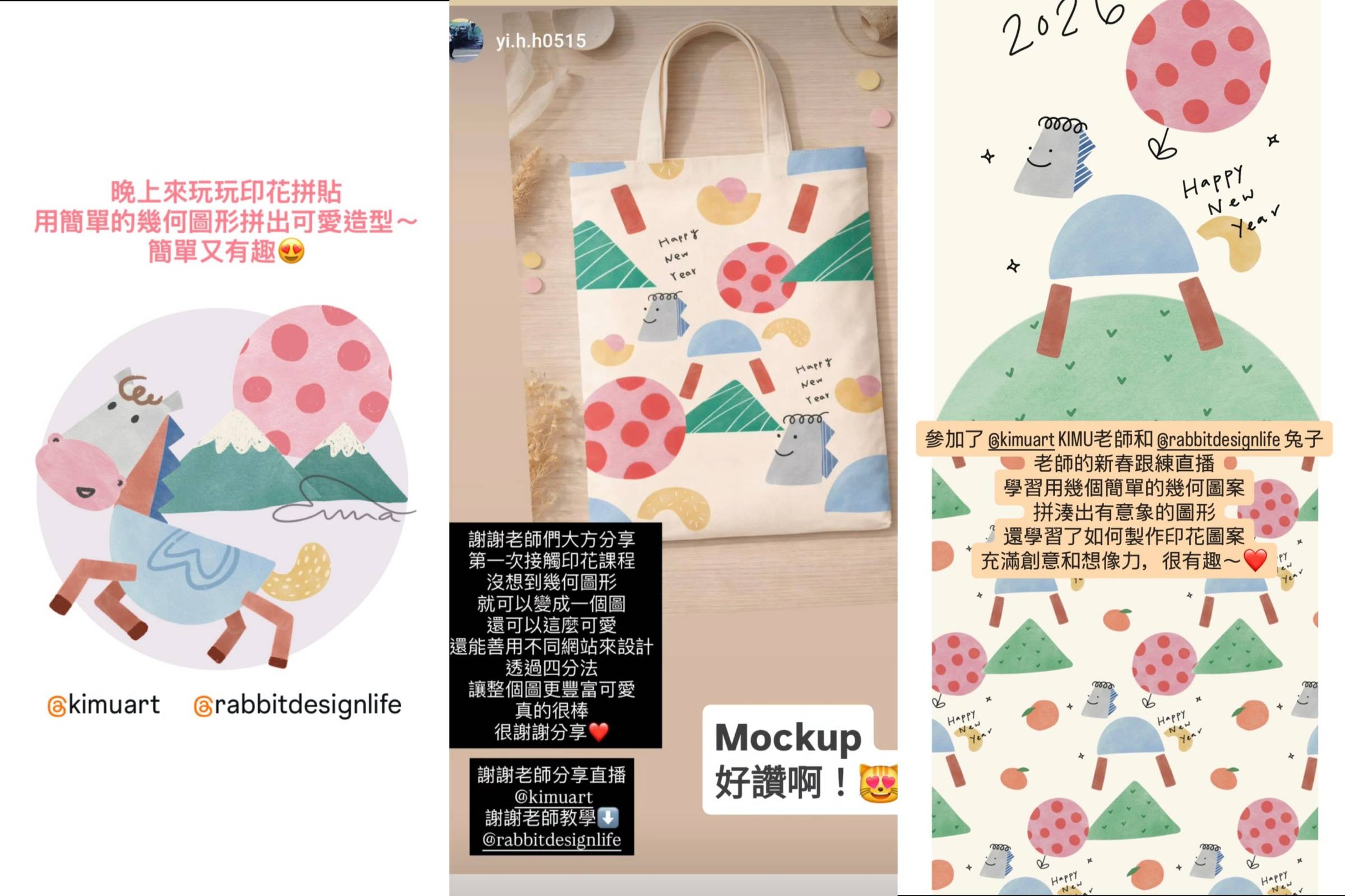 平安✨Reader 週四的直播真的很有趣, 完全沒有想到只用簡單的幾何圖形,就能拼貼出既可愛又溫馨的圖案。 最棒的是這些設計實用性很高,可以放在提袋、床單或枕頭上當作印花圖案都非常合適。 看到原本生硬的幾何圖形,在大家手中慢慢拼湊成有模有樣的小馬,那種驚喜感真的很療癒! 這次直播我們不僅實作了「馬年」專屬的印花紅包袋,兔子老師更深入分享了「印花設計師」的職涯營運, 以及如何將一次性的案子轉化為可以持續工作的版權資產。 無論是對於印花思維的建立,還是對於設計變現的管道(如 POD 平台 Spoonflower),相信大家都有滿滿的收穫🥰 直播回放來啦!這樣的小夥伴也不用擔心哦,這邊會提供回放連結給大家囉~~~ 由於兔子老師對於分享內容有特定的考量,這場直播僅限時回看到 1/30(五)喔! 還沒跟上進度或想複習對齊圖案、四方連續排版技巧的小夥伴,一定要把握時間!